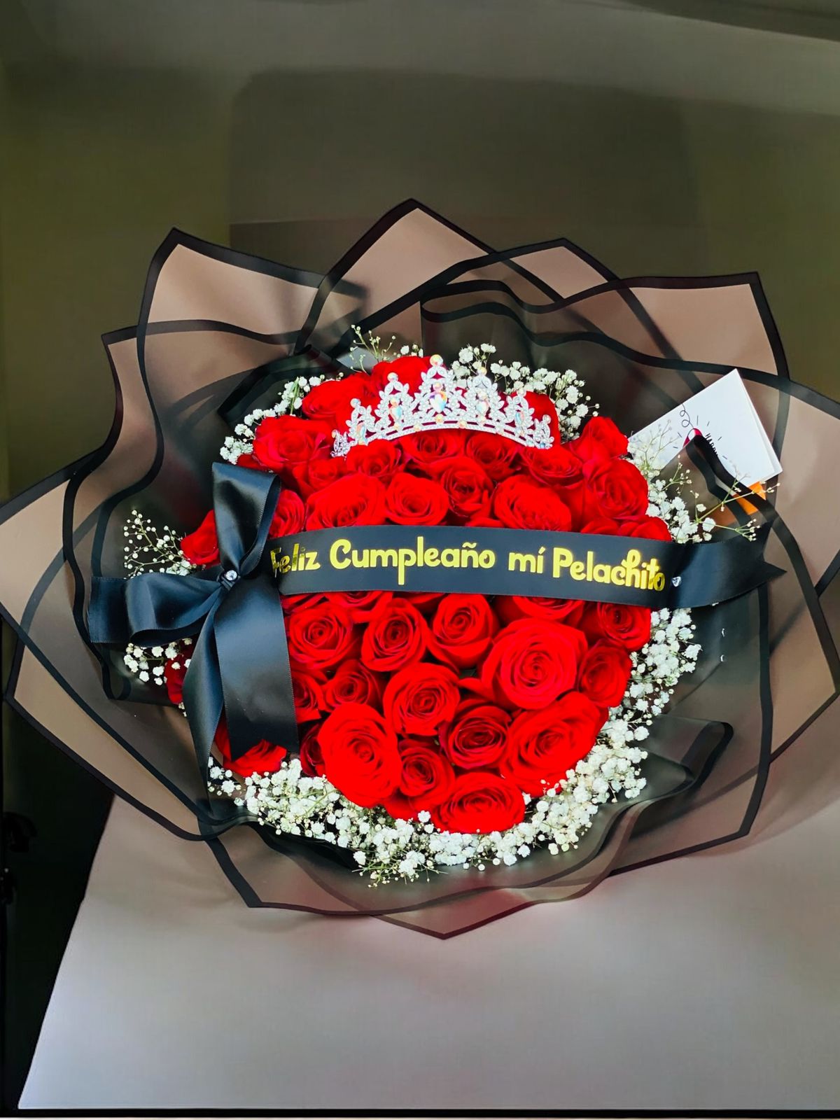 Ramo de 50 rojas decoradas con gipsophilia en color blanca al rededor, un listón con frase personalizada y una corona tipo tiara. Envuelto en papeles decorativos