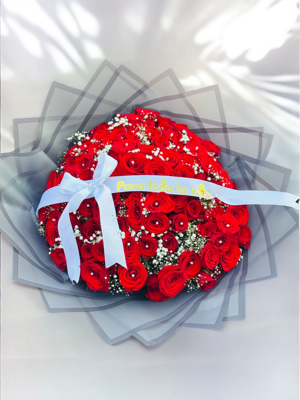 Ramo de 50 rosas rojas decoradas con gipsophilia blanca en el centro y un listón con frase personalizada. Envuelto en papeles decorativos