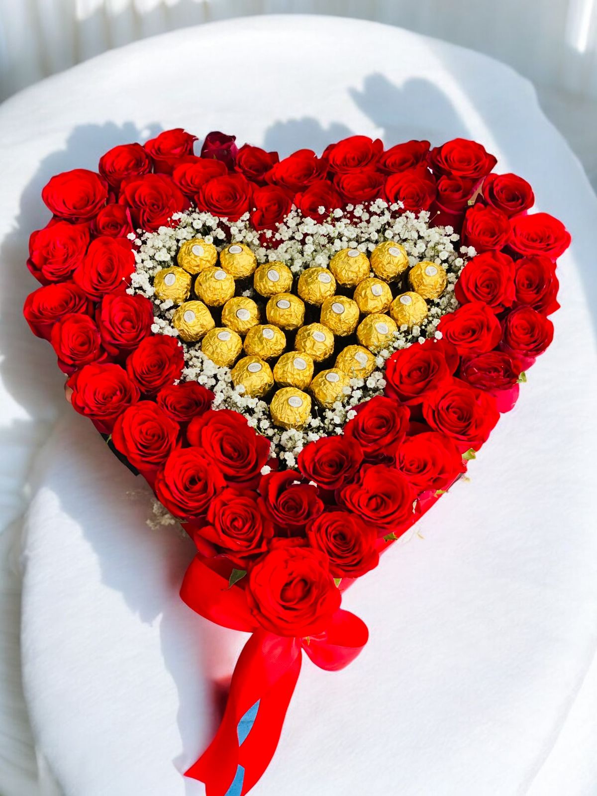 Corazón de mdf de 40 cm de alto con 60 rosas rojas y detalle de gipsophilia y 24 chocolates Ferrero Rocher.