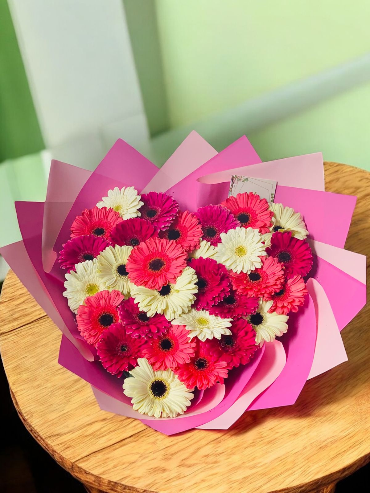Ramo de 30 gerberas rosas, blancas y fiushas en forma de corazon. Envuelto en papeles decorativos