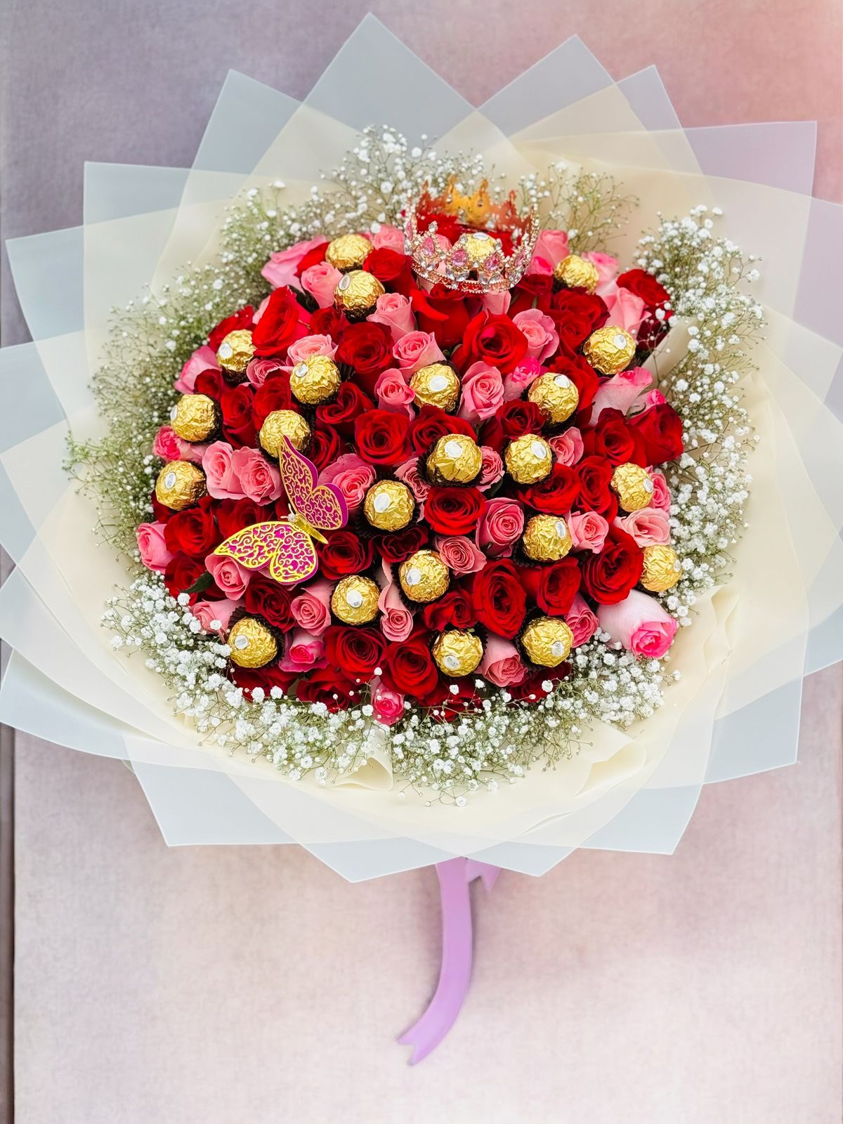 Ramo de 100 rosas en colores rosas y rojas, decorado con gipsophilia blanca al rededor, 24 chocolates Ferrero Rocher, mariposas decorativas y una corona. Envuelto en papeles decorativos