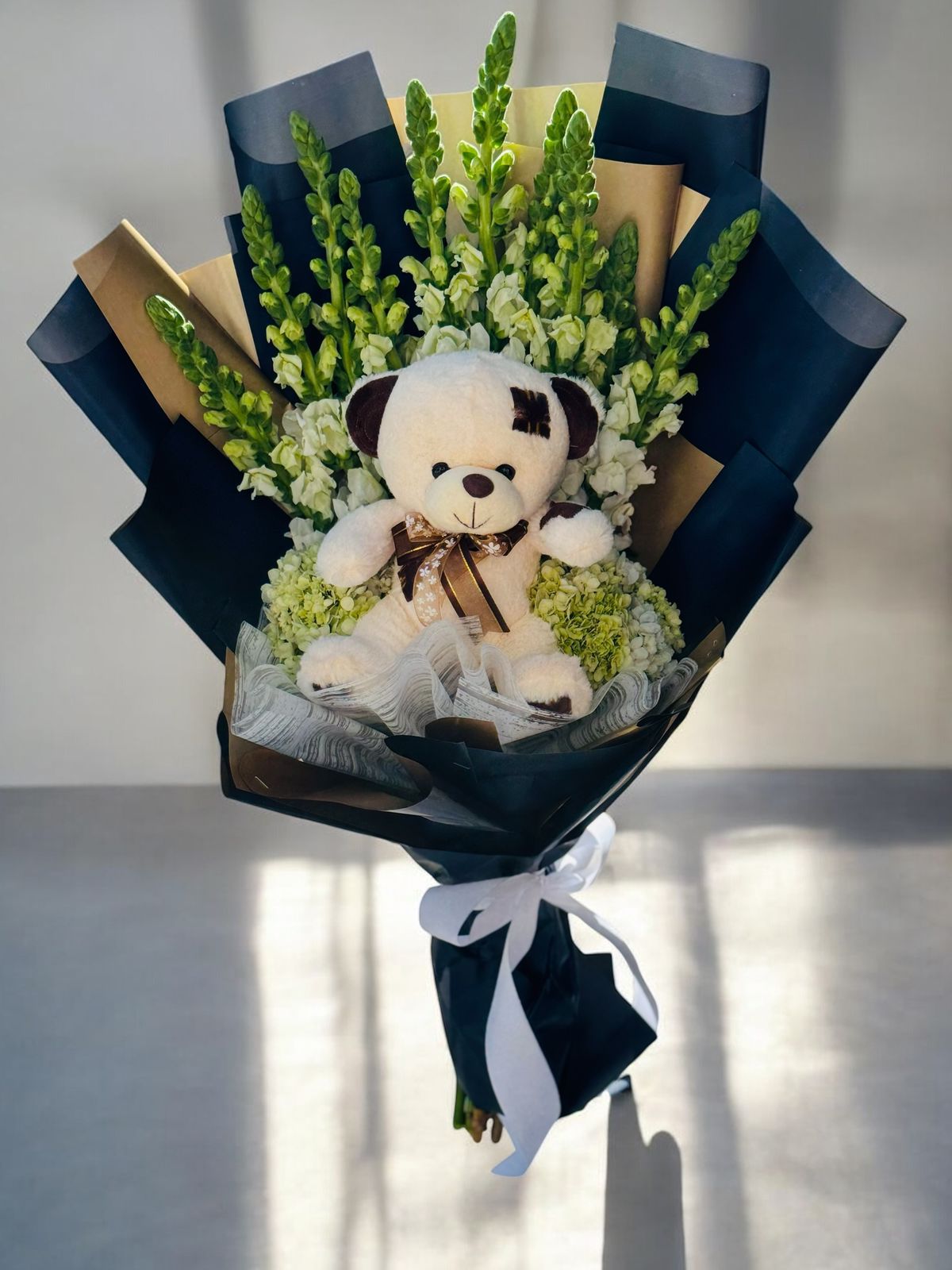 ramo con 10 flores de perrito en color blanco, 2 flores de hortencia en color verde a los costados y un oso de peluche de 25 cm, envuelto en papeles decorativos