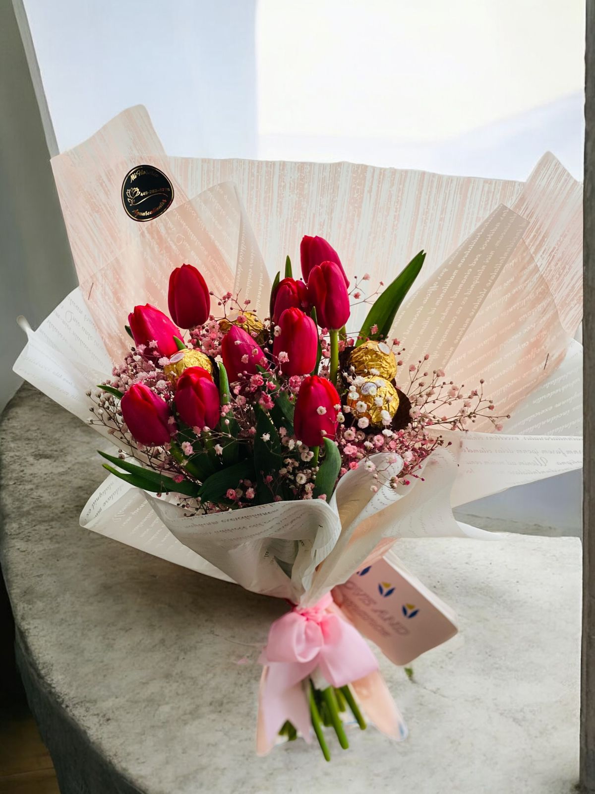 ramo de 10 tulipanes en color rojo, decorados con gipsophilia en color rosa y 4 chocolates Ferrero Rocher. Envuelto en papeles decorativos